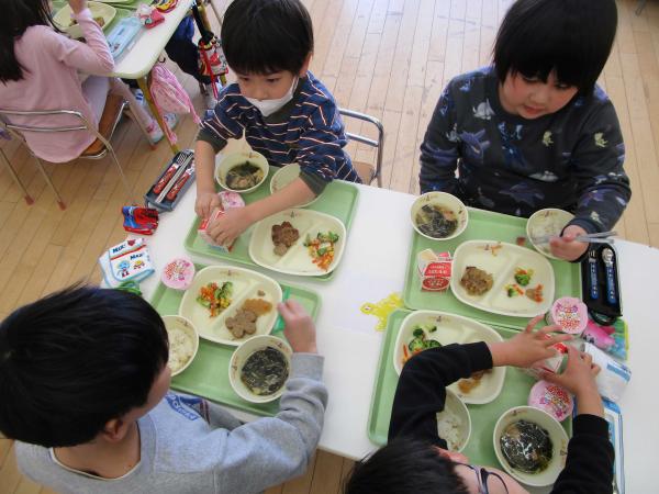 今日の年長組の様子です。明日に卒園式をひかえ、今日が通常保育の最終日となりました。まずは、最後の卒園式の練習を行いました。今日は年少さん、年中さんにも見てもらいました。最後の交流となりました。給食には、お祝いゼリーも出ました。楽しく、美味しくいただきました。