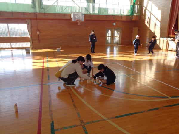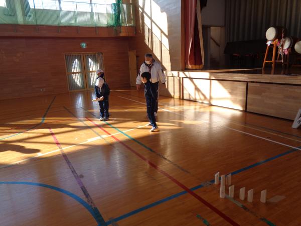 昼休みに、モルック体験を行いました。11月の「世界あそび万博」で教えて頂いたモルックを学校で購入しました。 木の棒をボーリングのように投げて、点数を競います。今日は1~3年生が体験の日でした。だんだんコツをつかんで楽しく遊んでいました。