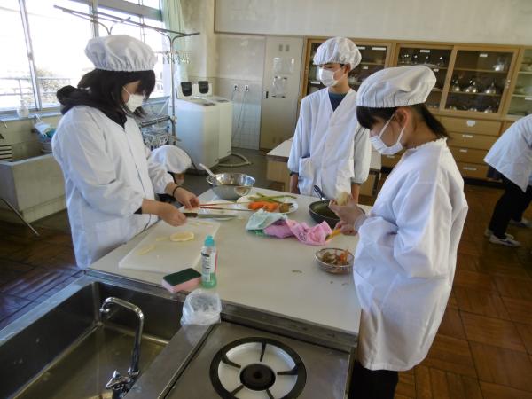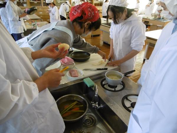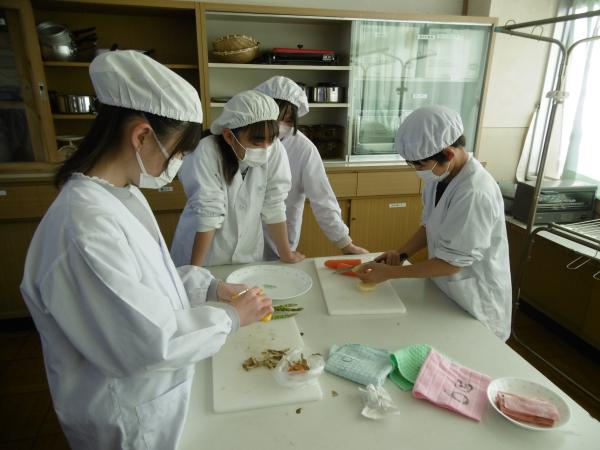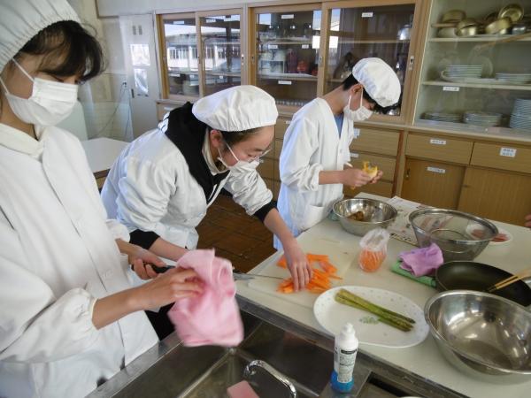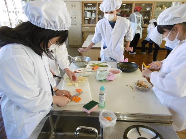 今日は6年生が1、2時間目に調理実習を行いました。 野菜のベーコン巻きを作りました。まずは野菜を洗い、皮をむいています。 包丁の使い方も慎重で丁寧に切ることができました。 フライパンで焼いで、最後はみんなで美味しく頂きました。