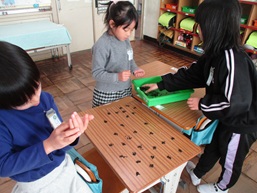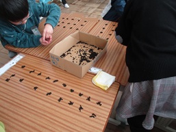 今日は、新1年生へのプレゼント作りで、あさがおの種をメッセージ入りの袋に入れました。そして、学校で収穫できた箱いっぱいのあさがおの種。「全部でいくつあるのかな?」という疑問に、グループで手分けして数えました。算数「大きな数」で学習したことを思い出し、どのグループも10このまとまりを作って数えていました。