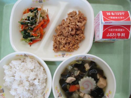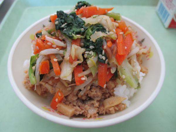 《こんだて》金芽米ごはん 牛乳 ビビンバの具(豚そぼろ・ナムル) わかめスープ