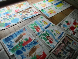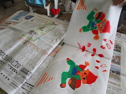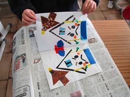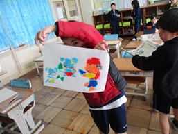 今まで取り組んできたカラータック版画が仕上がりました。重ねた紙をこすって、めくると・・・「わあ!きれい!」「写った、写った!」と歓声が上がりました。