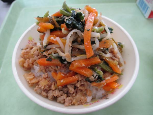 今日の給食は、ひなまつりこんだてです。ごはんにあえものをのせたら、彩りがきれいなちらしずしの完成です。