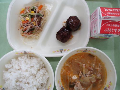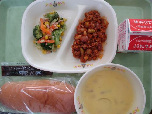 今日の給食は、チリコンカンのこんだてです。豆が苦手な人でも食べやすい味付けです。