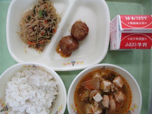 《こんだて》金芽米ごはん 牛乳 肉団子 チャプチェ みそキムチスープ 今日の給食は、韓国料理のチャプチェのこんだてです。給食では、春雨・豚肉・野菜などに、しょうゆ・みりん・酒・鶏がらスープ・コチュジャン・砂糖で味付けしています。