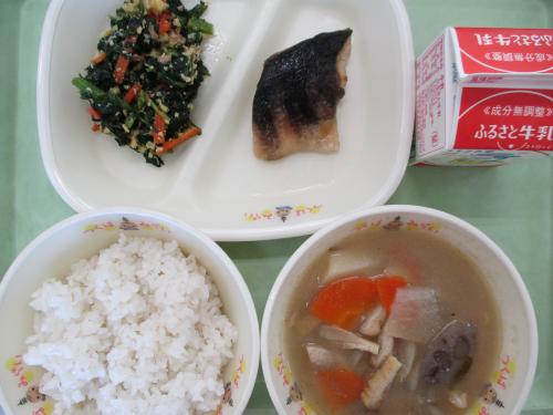 《こんだて》金芽米ごはん 牛乳 ほっけの一夜干し たまごと春菊のあえもの 根菜汁