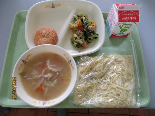 《こんだて》中華めん 牛乳 さつまいものパイ 小松菜とキャベツのサラダ とんこつスープ