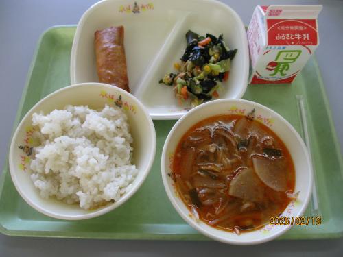 《こんだて》金芽米ごはん 牛乳 春巻き わかめとツナのサラダ キムチスープ