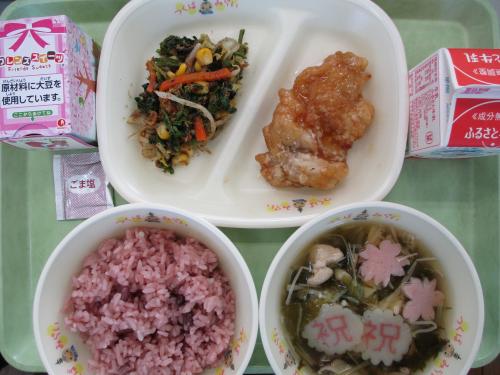 《こんだて》~卒業お祝いこんだて~ 赤飯 ごま塩 鶏肉のレモン煮 おかかあえ お祝いすまし汁 お祝いケーキ 今日の給食は、赤飯やケーキなど、6年生の卒業をお祝いしたこんだてです。すまし汁には、「祝」の文字が入ったなるとや、桜の形のかまぼこが入っています。