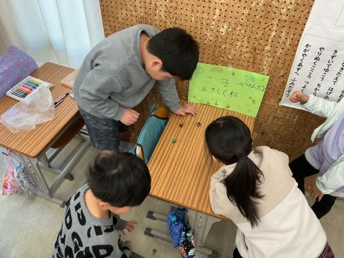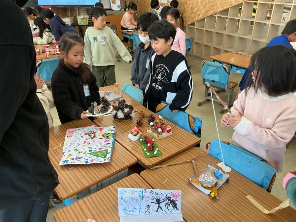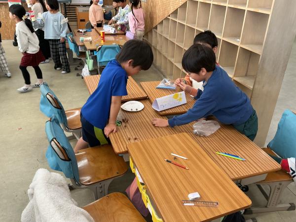 秋の材料を使って おもちゃを作りました。どんぐりコマ屋さん、松ぼっくりのけん玉屋さん、どんぐり迷路屋さん、など子供たちが工夫してお店を開く準備をしています。遊びの中からたくさん発見できる1年生です。