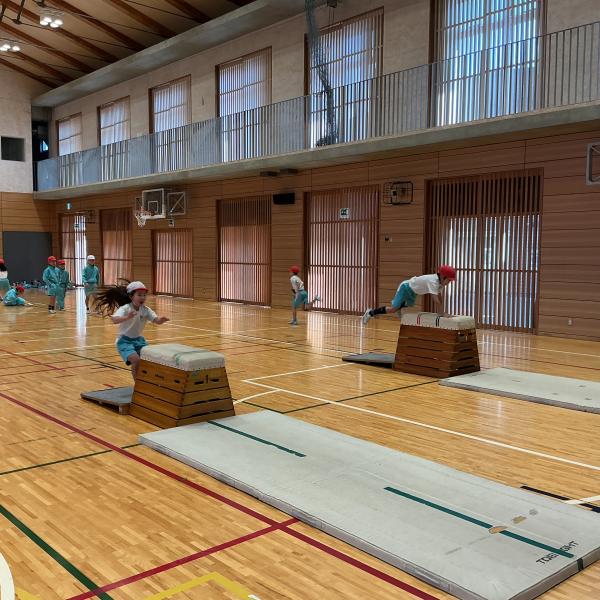 本日の体育では、わくわくにんじゃランド(跳び箱)を行いました。 跳び箱の準備、片付けの方法、場の設定の仕方について確認をしました。全員で協力して準備や片付けに取り組むことができました。