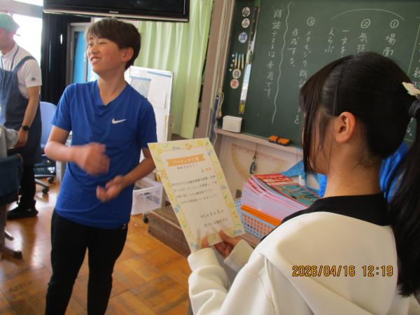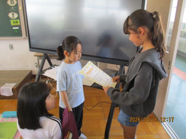 保健委員会は、衛生検査でハンカチ・ティッシュの持参・つめの検査でクラスの全員がパーフェクトだった1・2・6年生に、「パーフェクト賞」を届けていました。