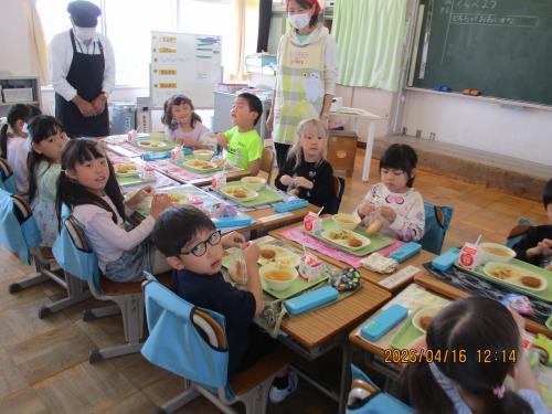 今年度初めて、給食にパンが出てました。1年生教室では、パンの袋の開け方を、先生からよく聞いて食べていました。気を付けて一人一人上手に開けられました。