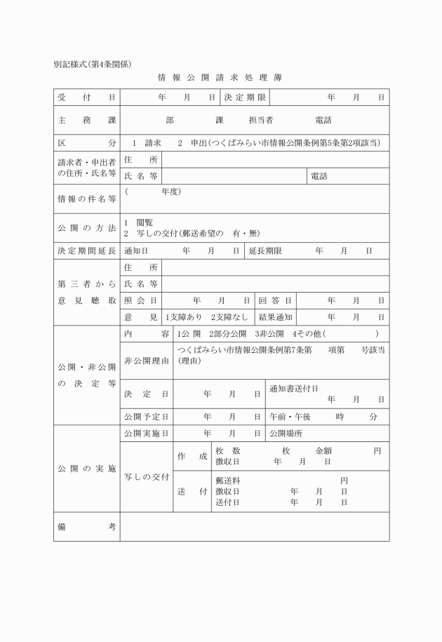 総務課は、公開請求又は申出を受けたもの(出先機関で受け付けたものを含む。)について、その処理状況を情報公開請求処理簿(別記様式)に記録しておく。