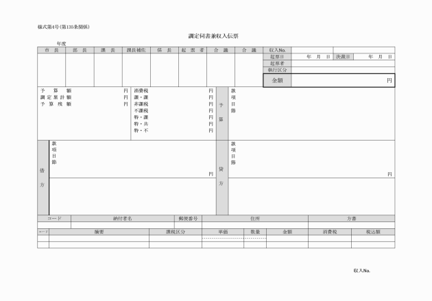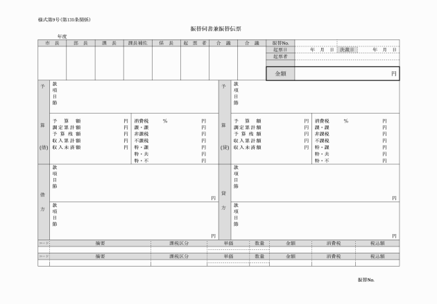 第6条 伝票の種類は、調定伺書兼振替伝票、調定更正伺書兼振替伝票、収入伝票、調定伺書兼収入伝票、支出負担行為伺書兼支出命令書、支出命令書、支払伝票、支出負担行為伺書及び振替伺書兼振替伝票とし、それぞれ決裁票、借方票及び貸方票からなる。