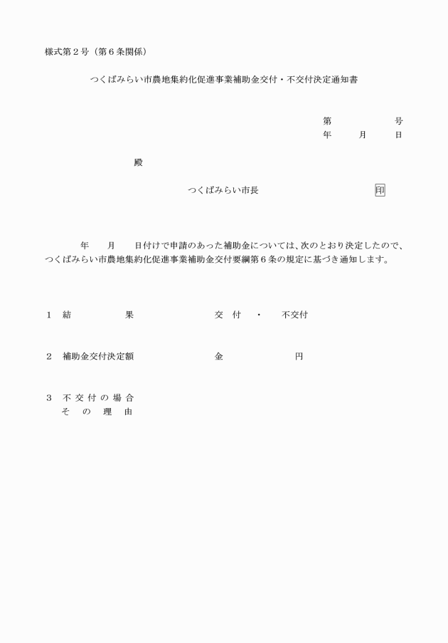 第5条 補助金の交付を受けようとする者(以下「申請者」という。)は、対象農地について耕作者変更したことを証する書類及び対象農地の位置図を添付し、つくばみらい市農地集約化促進事業補助金交付申請書(様式第1号)を市長に提出しなければならない。