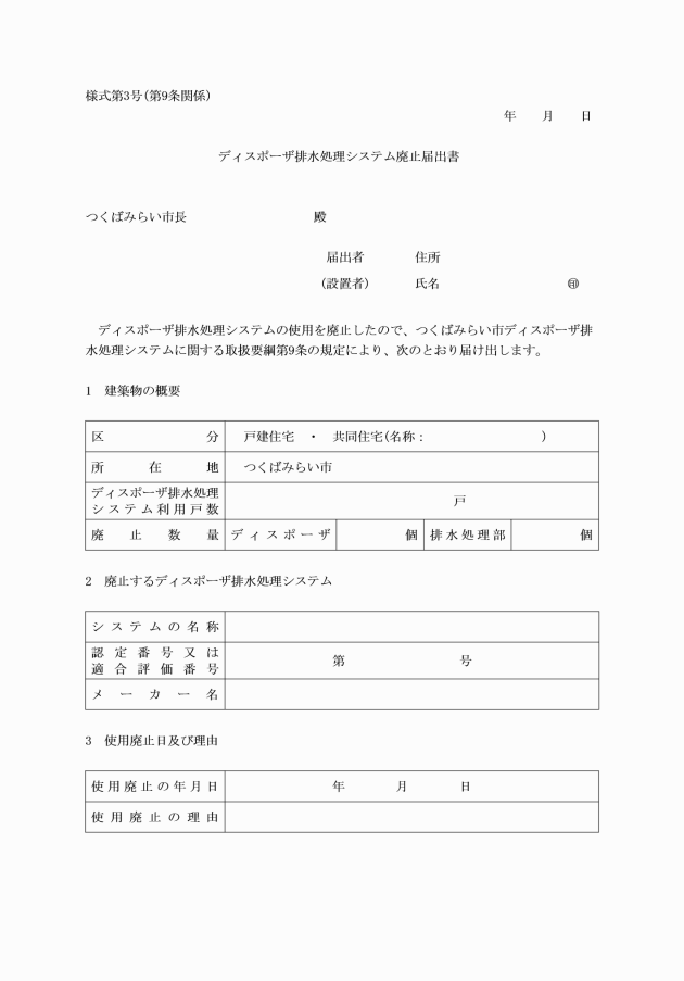 第9条 使用者又は管理組合等は、ディスポーザ排水処理システムの使用を廃止するときは、ディスポーザ排水処理システム廃止届出書(様式第3号)により市長に届け出なければならない。